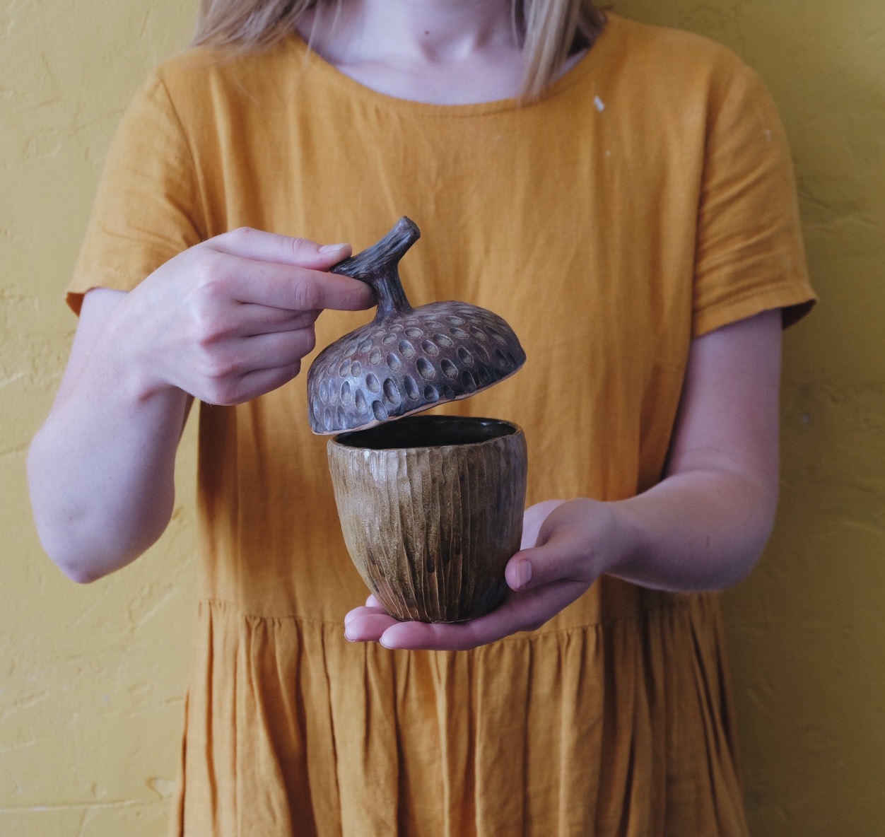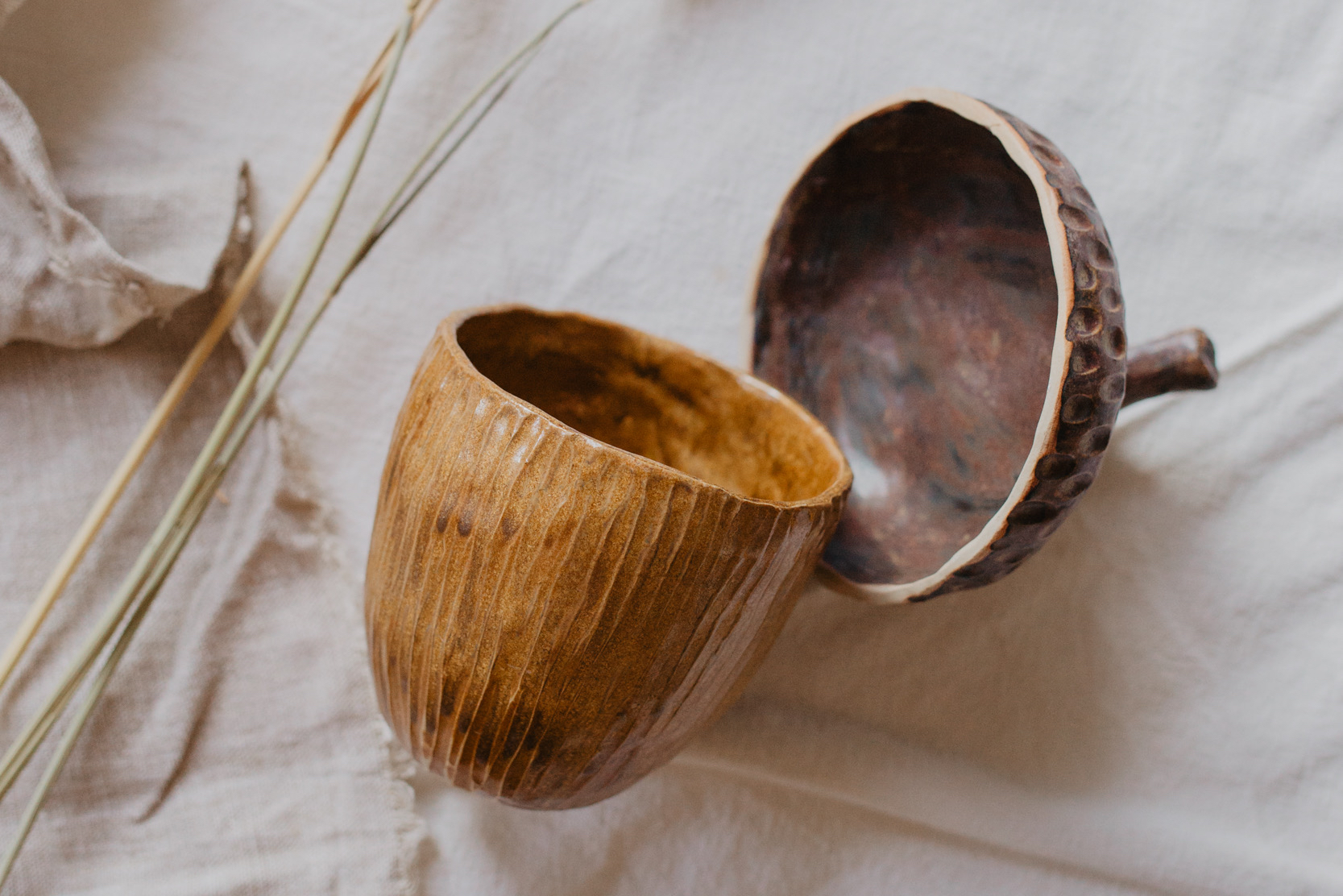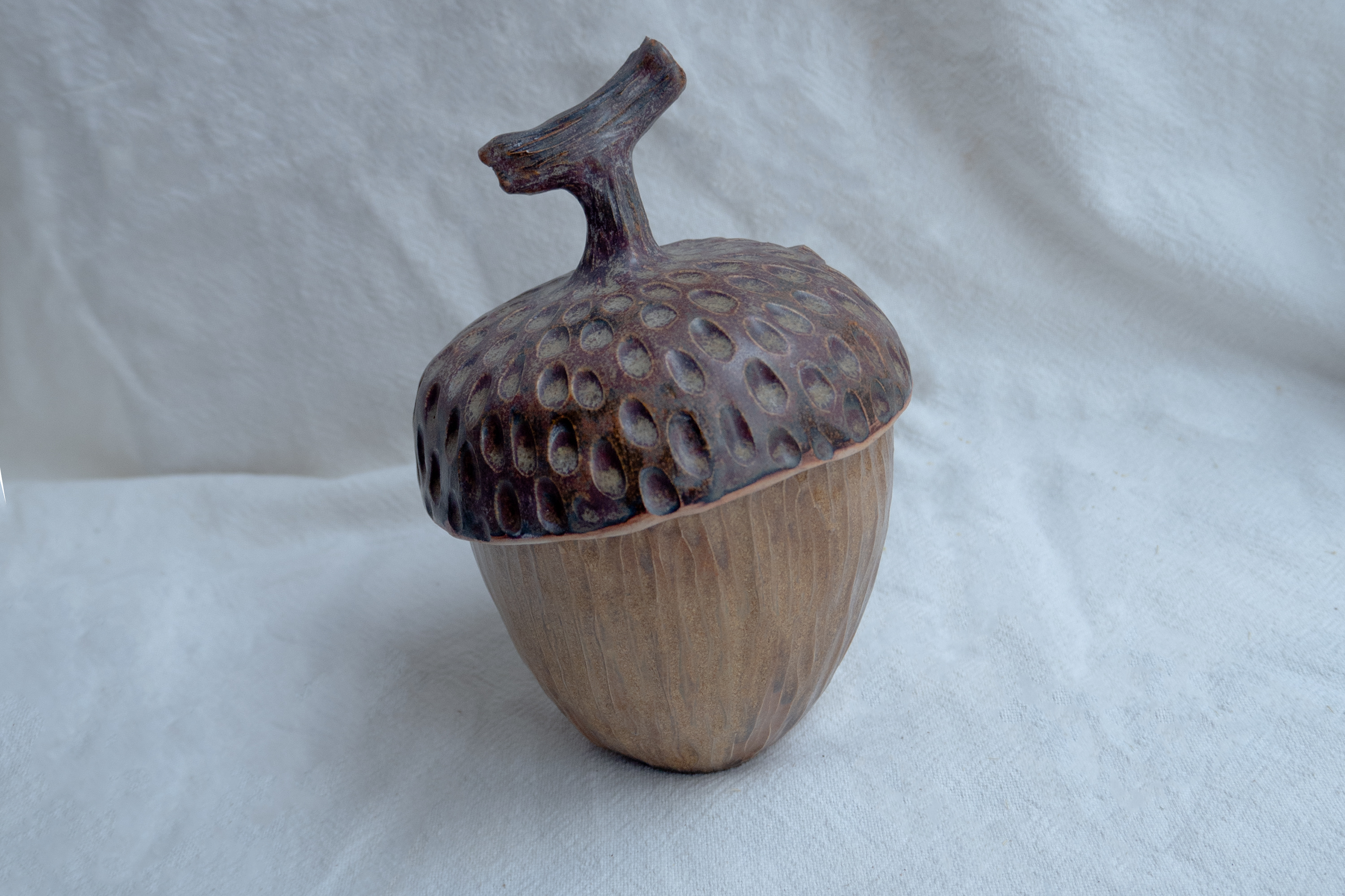 Вначале мы с вами будем лепить сам стаканчик - разминаем глину, разглаживаем, простукиваем, снова заглаживаем и отставляем в сторонку. Далее делаем шапочку. Кстатии, вы знали, что крышечка желудя называется "плюска"? Так вот, лепим эту плюску, примеряем, чтобы хорошо садилась, прикрепляем маленькую ручку. Вот и пролетело 2 часа!